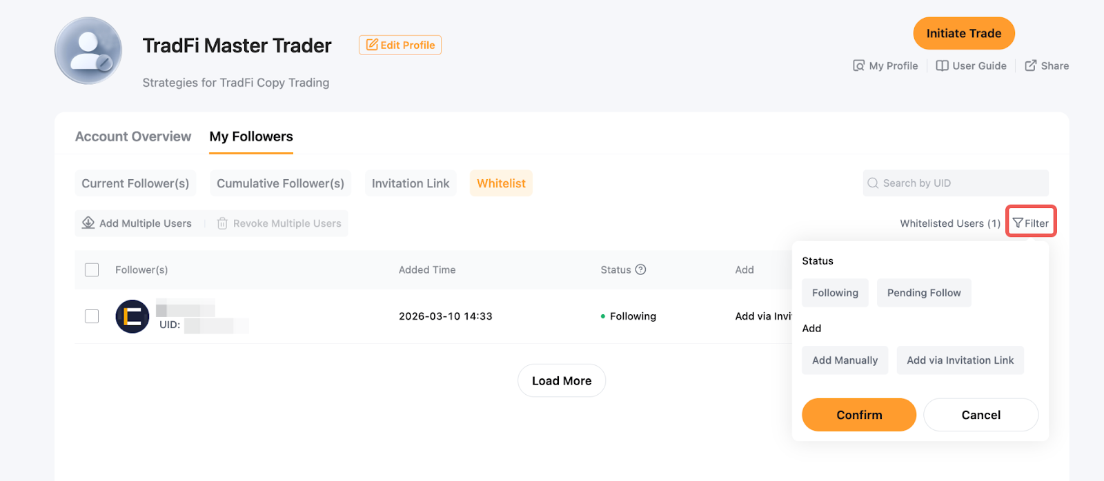 Копітрейдинг TradFi пропонує дві функції — «Запрошувальне посилання» та «Білий список підписників», — які дають змогу майстер-трейдерам керувати тим, хто може копіювати їхні угоди.
