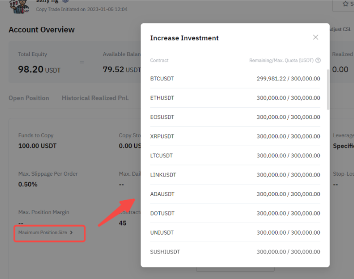 Максимальний розмір позиції показує залишок і максимальну вартість замовлення, яку можна дотримуватися для ваших копіугод, отриманих на основі розмірів ваших позицій як у лонг, так і в шорт напрямках.
