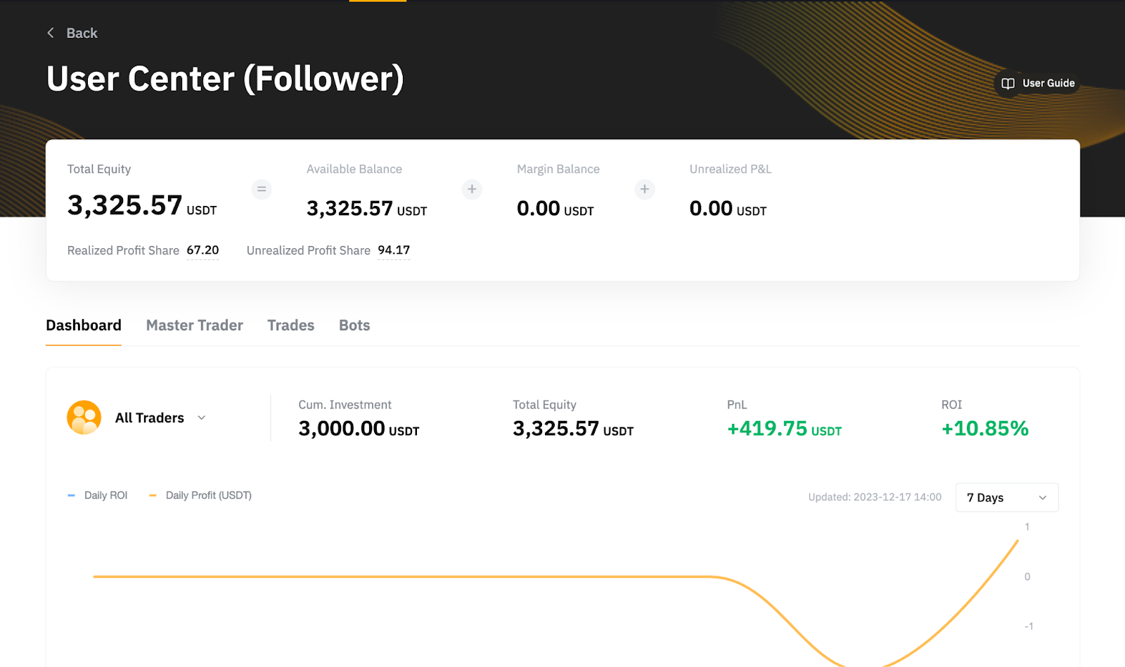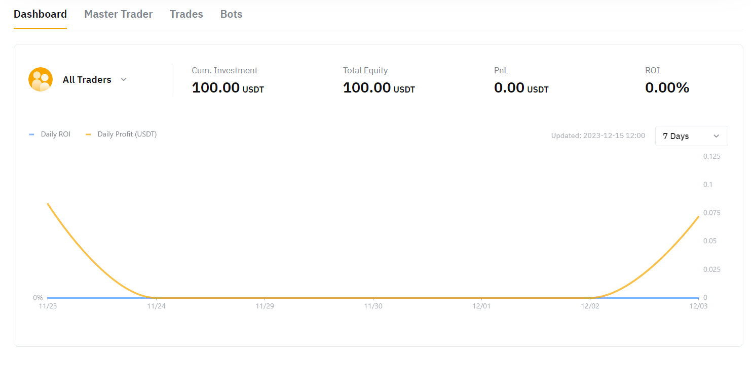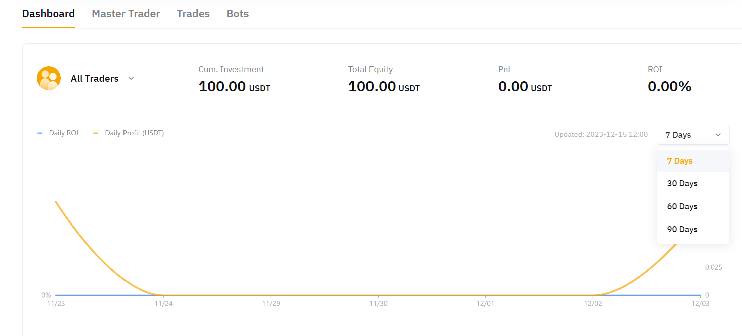 Тут можна дивитися поточні результати за P&L і ROI всіх Майстер-трейдерів, на яких ви підписані, або фільтрувати Майстер-трейдерів, щоб переглядати їхні результати окремо.