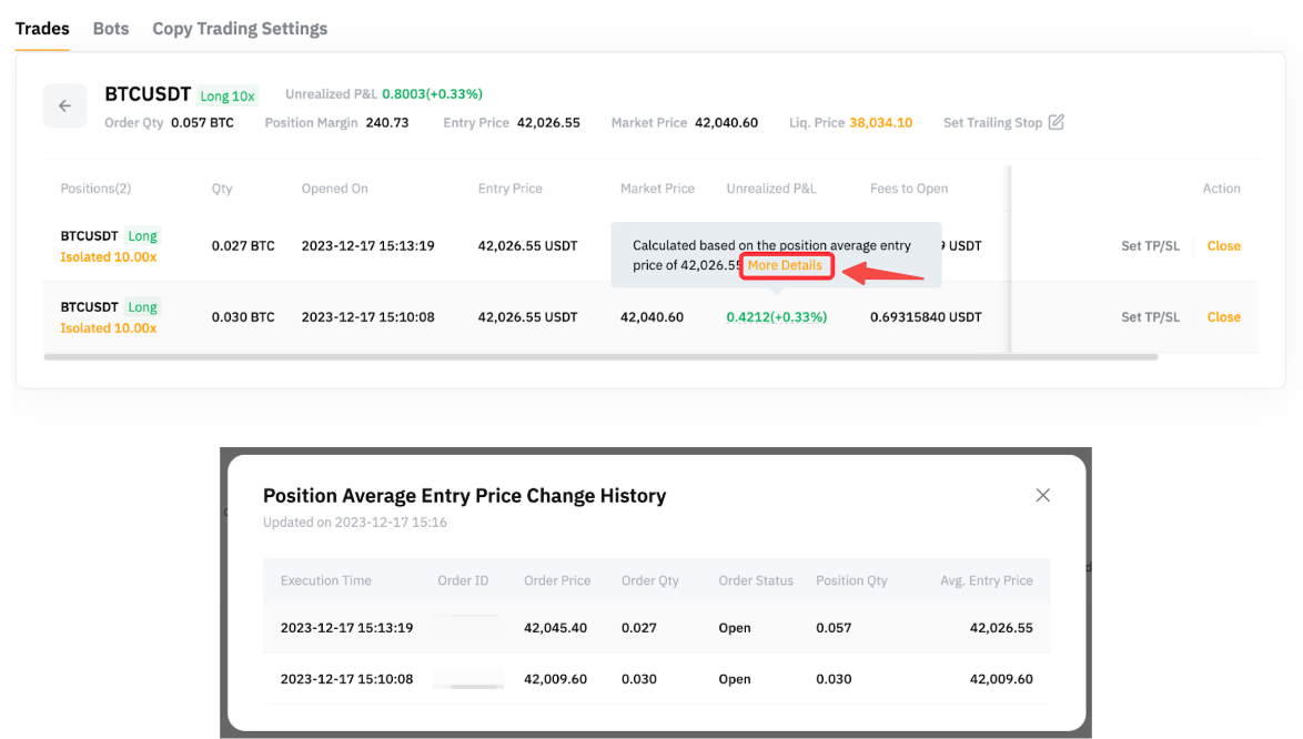 У розділі Деталі позиції можна переглянути деталі кожного ордера, скопійованого за позицією. Зверніть увагу, що ціна входу, яка відображається в деталях позиції, є середньою ціною входу на позицію. Щоб перевірити, як визначається ціна входу в позицію, ви можете перемістити курсор до нереалізованих прибутків і збитків і натиснути Докладніше, щоб переглянути історію змін середньої ціни входу на позицію.