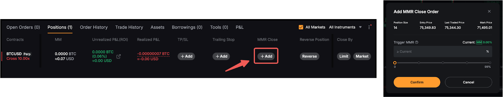 Натисніть «Додати» під «Закриття за MMR» на вкладці позицій. Потім установіть бажане тригерне значення MMR.