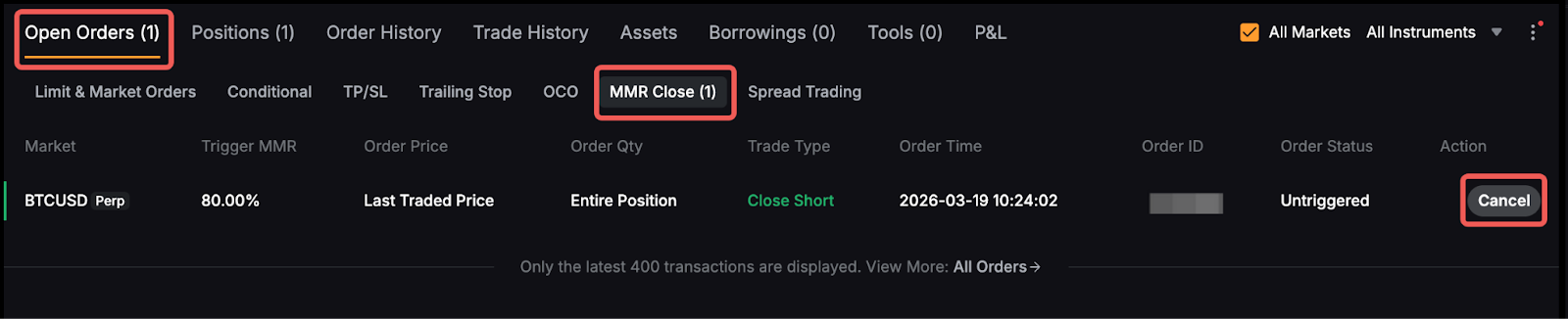 Щоб скасувати ордер на закриття за MMR, перейдіть до «Відкриті ордери» → «Закриття за MMR» і натисніть кнопку «Скасувати» в стовпці відповідних деталей ордера.