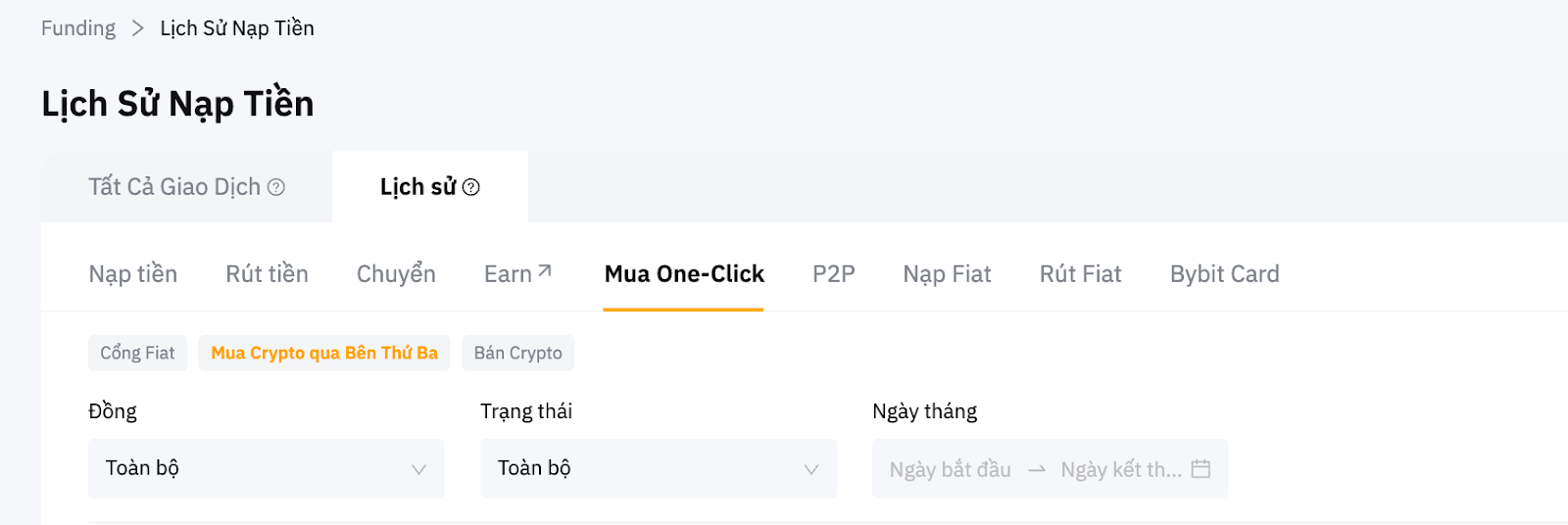 Bạn sẽ có thể truy xuất hồ sơ nạp tiền từ trang tài sản Bybit của mình trong tab Mua One-Click bằng cách nhấp vào Mua Crypto qua Bên Thứ Ba.