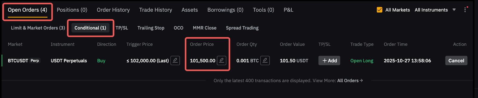 是的,您可以通过拖动限价单或条件单的价格线来修改订单。但请注意,这仅限于分别更改主动限价单或条件单的订单价格或触发价格。要更改您的条件订单的订单价格,您可以转到“未成交订单”→“条件单”选项卡。
