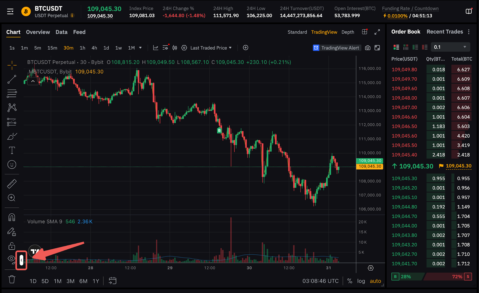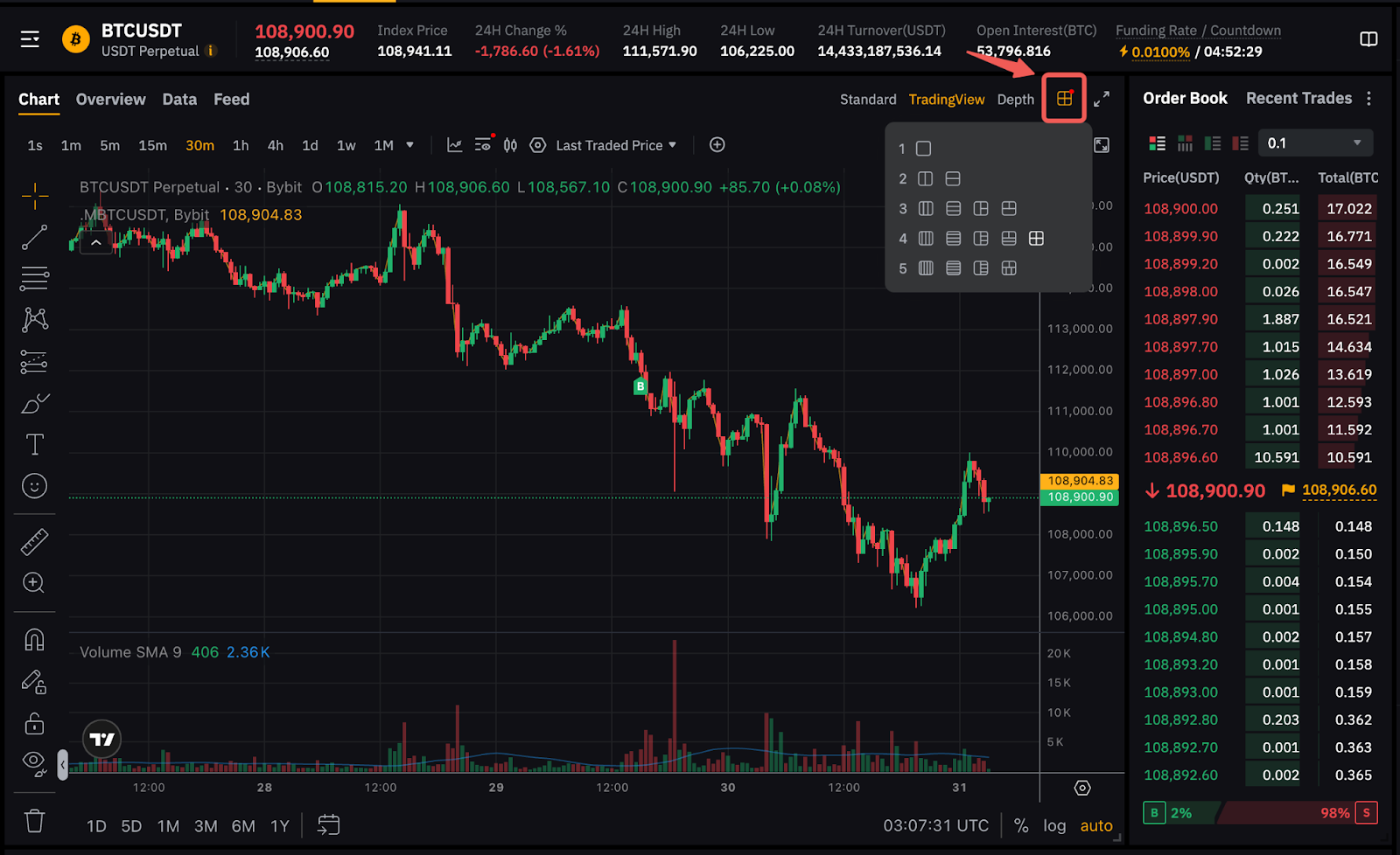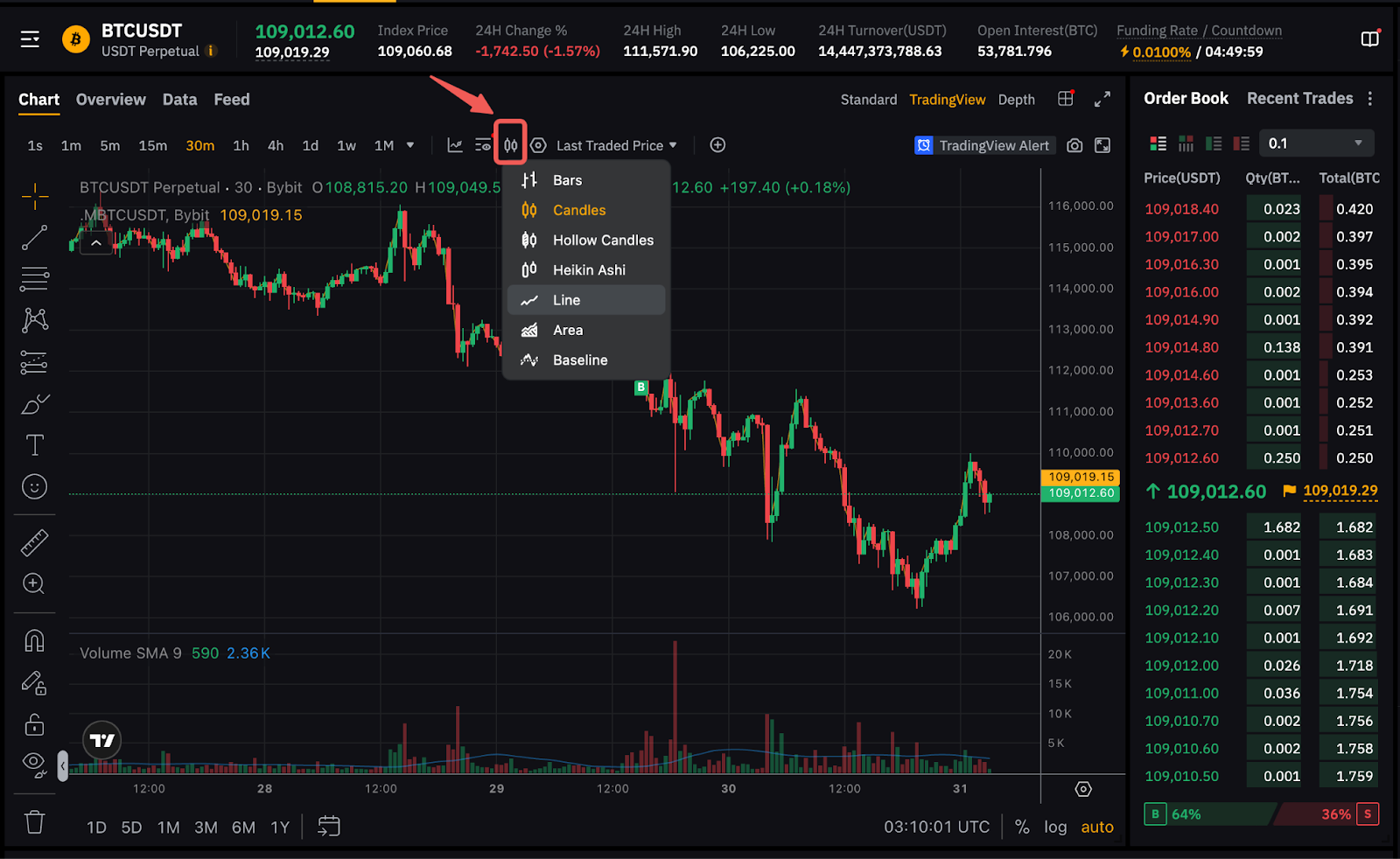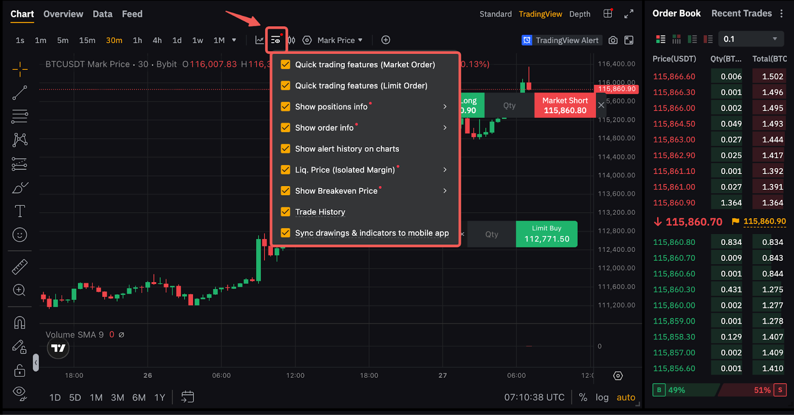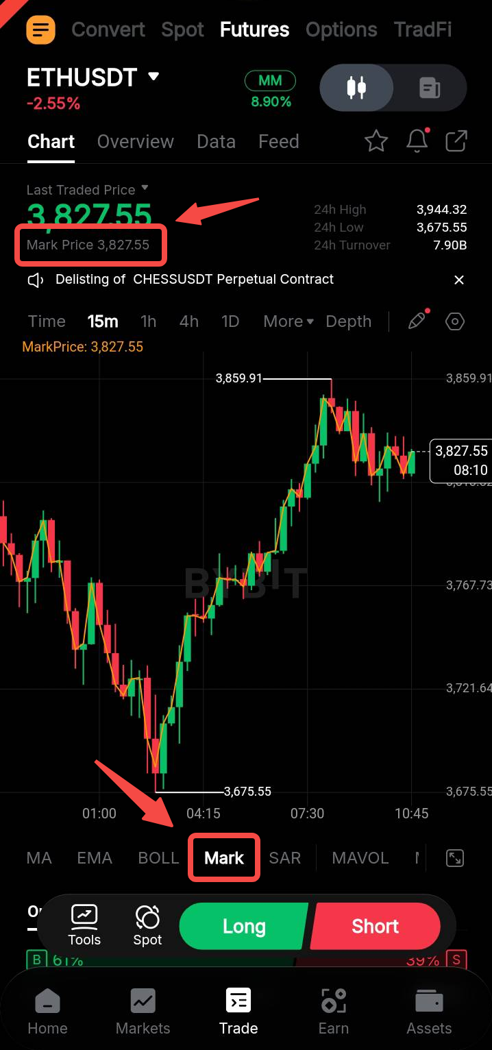 在Bybit App上,您可以启用图表底部的标记指标。