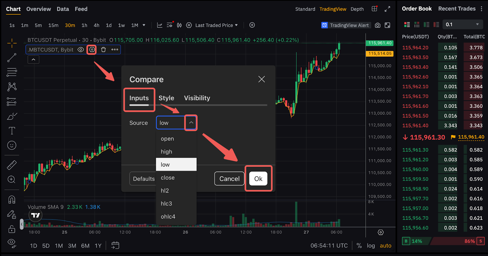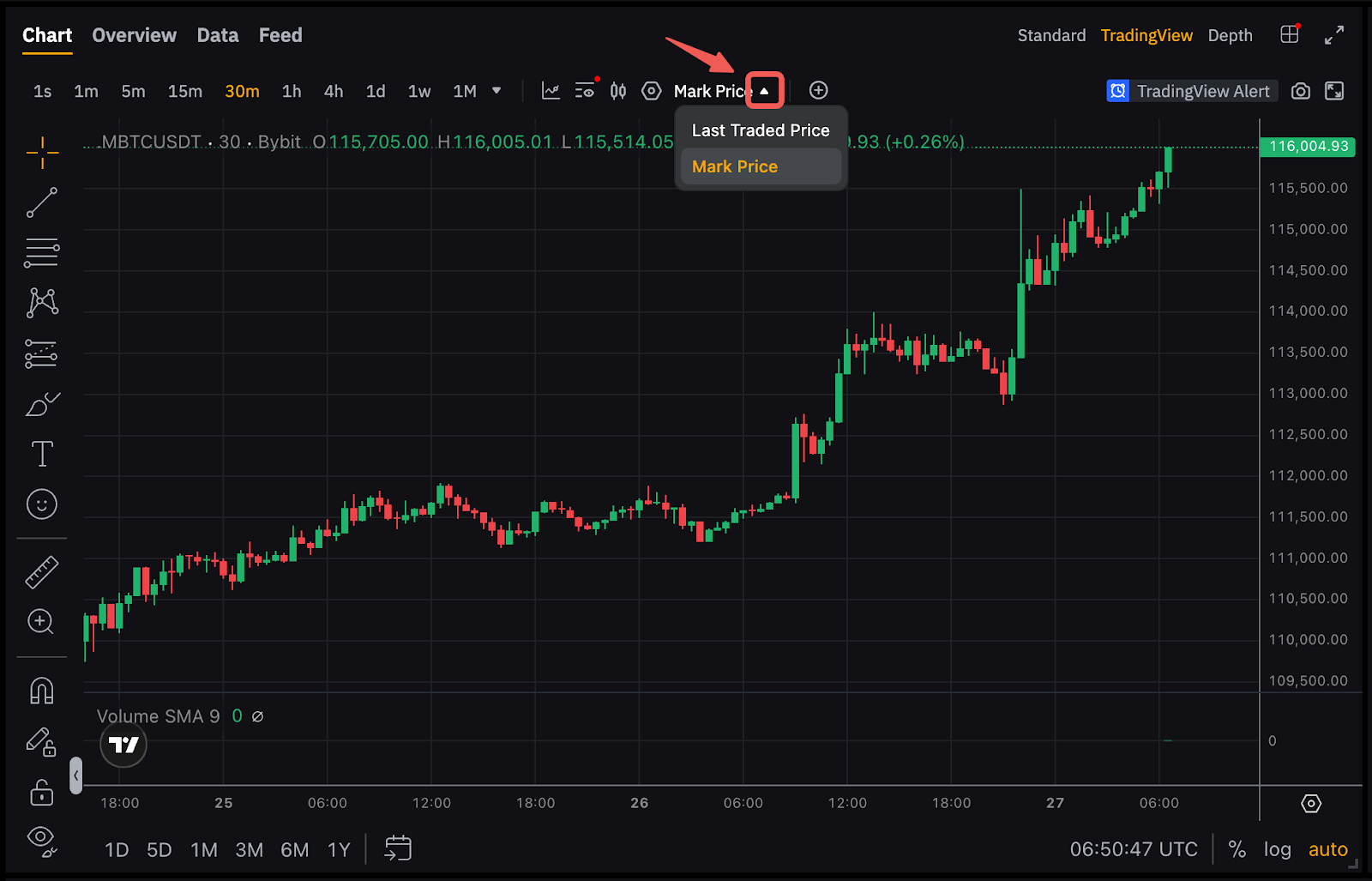 以BTCUSDT为例,点击图表单中的最后成交价格Last Traded Price,参考指标.MBTCUSDT,BYBIT。通过选择高(对于做空仓位)或低(对于做多仓位)来更改 .MXXX 黄线的设置。