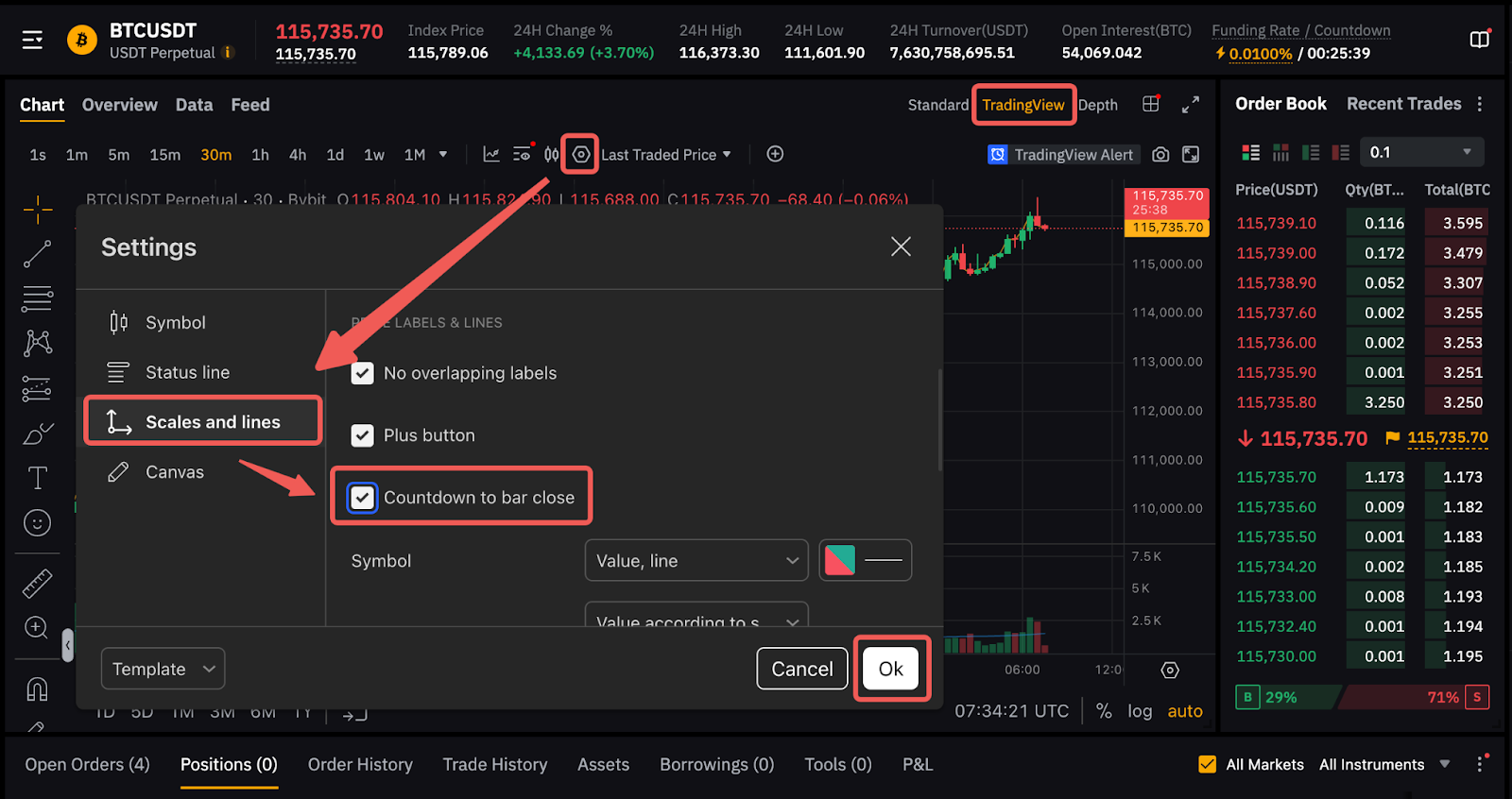导航到设置 → 比例和线条,然后在当前K线结束倒计时框中勾选以启用它。此功能目前仅在 PC 上可用。