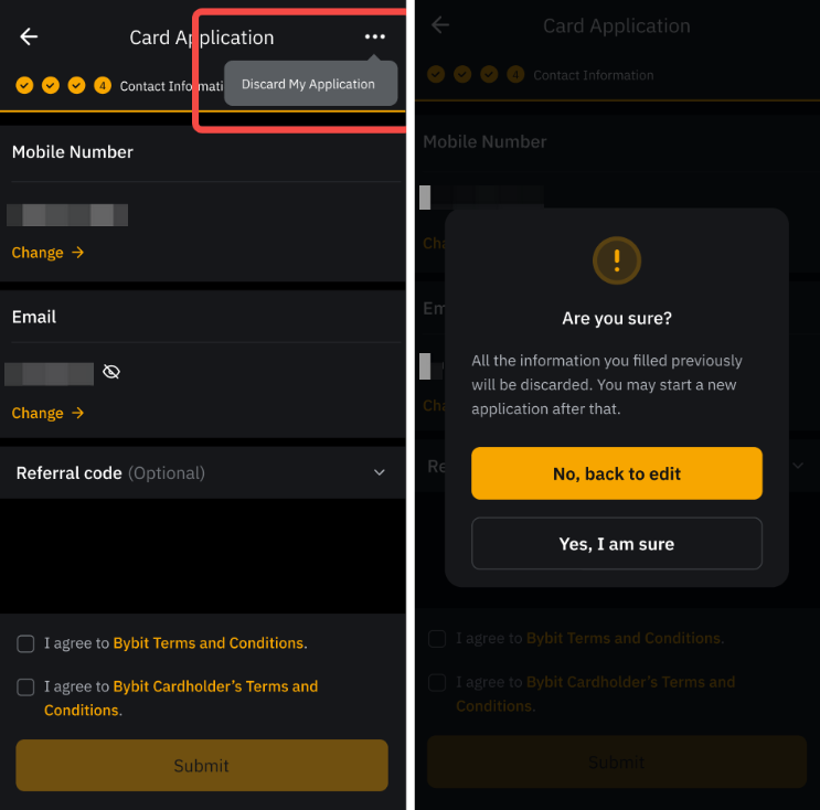 您可以通过单击查看我的申请 → 更多并选择取消我的卡片申请来取消您的 Bybit 卡申请。