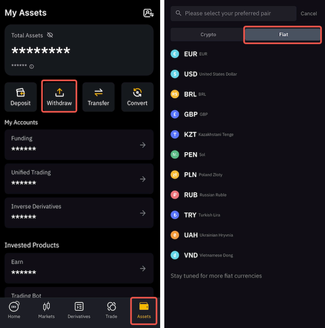 在 App 上,请前往资产选项卡,点击提币,然后切换至法币部分,以访问支持的法币列表。