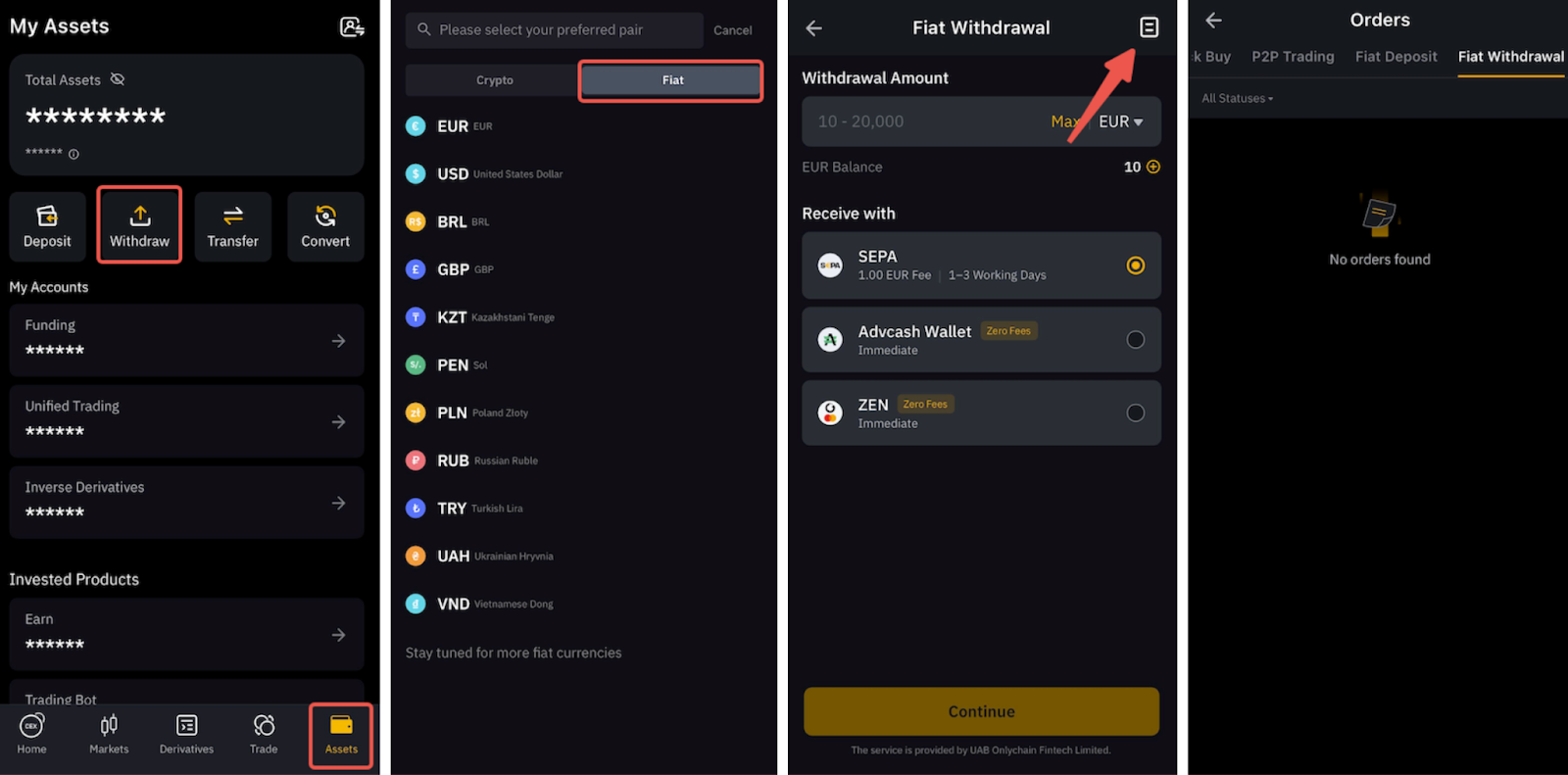 在 App 上,请前往资产选项卡,点击提币,然后切换到法币 → 选择任何法币 → 点击页面图标。