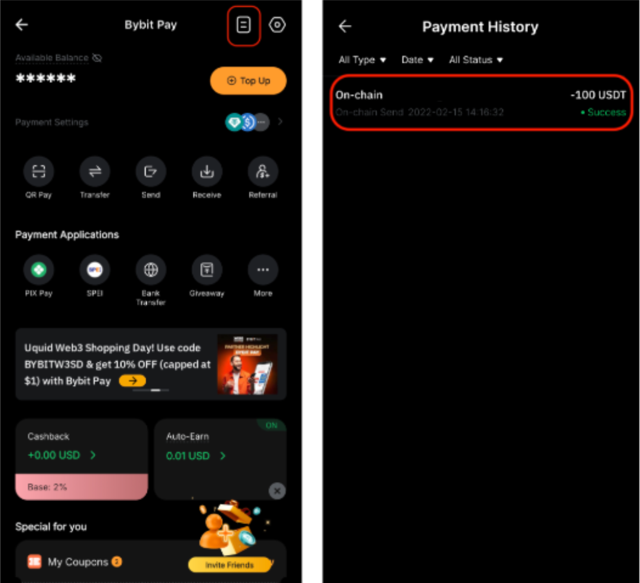 转到“Bybit Pay”页面,然后点击右上角的“付款历史记录”图标。