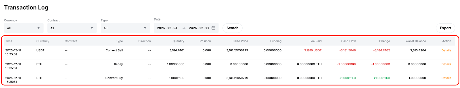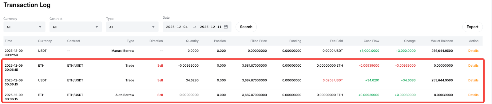以 ETH/USDT 现货杠杆交易卖出为例,一旦您的订单完成,资产变动将反映在三个单独的条目中: