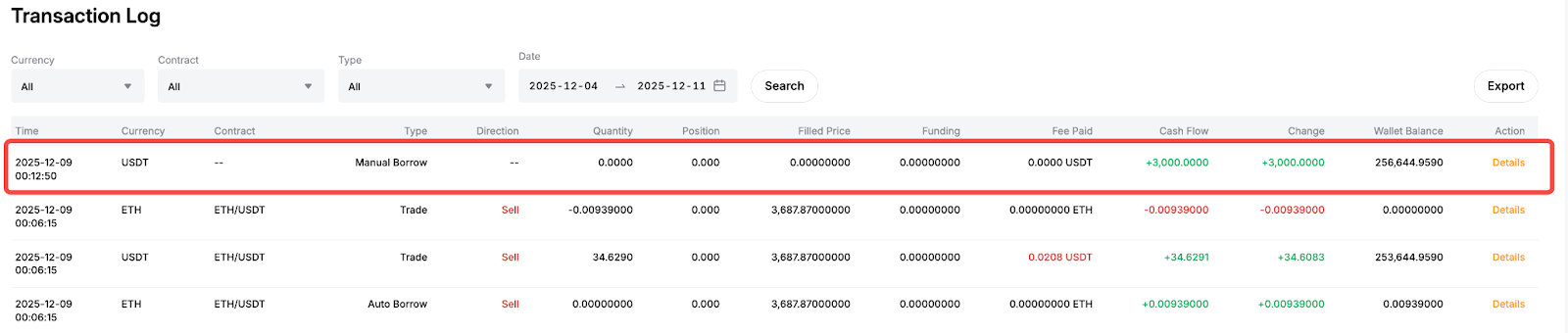一旦手动借贷订单成功,借贷的货币将记入您的统一交易账户,并记录为“手动借贷”。您的钱包余额将相应更新。由于此操作不是交易,“数量”一栏将显示,而“现金流”一栏将显示借入金额
