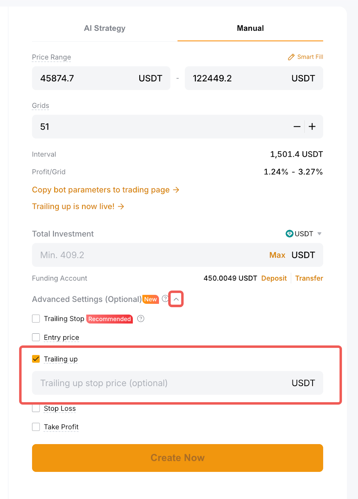 第 2 步:选择 AI 智能策略或手动创建,在高级设置(可选)中勾选上移功能,并根据需要设置上移限价。