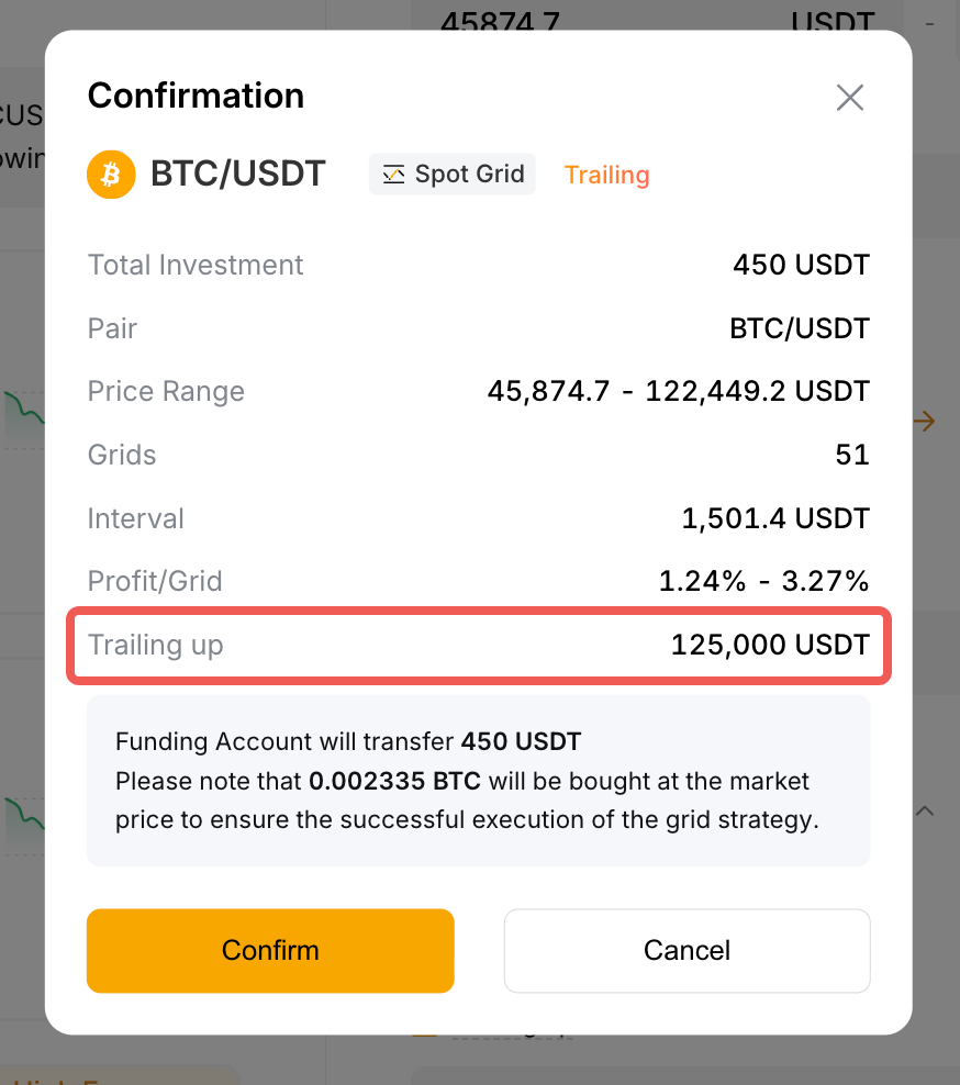 注:上移限价为触发网格停止上移的价格。若未设置,机器人将持续执行上移操作,直至可用资金不足以维持 5 个订单。