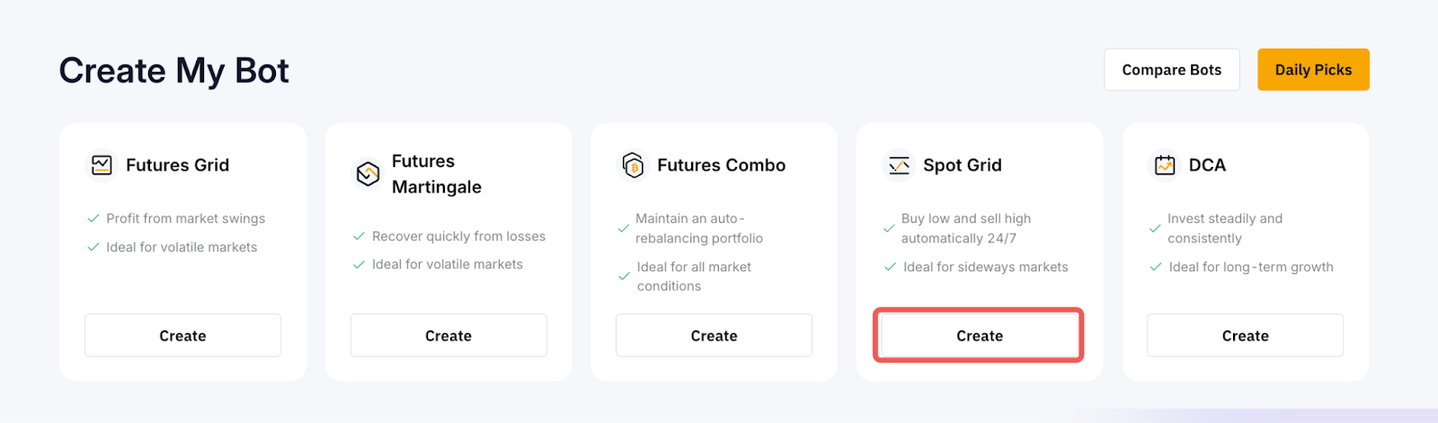 第 1 步:前往 Bybit 机器人 页面,在现货网格选项卡中点击创建按钮。