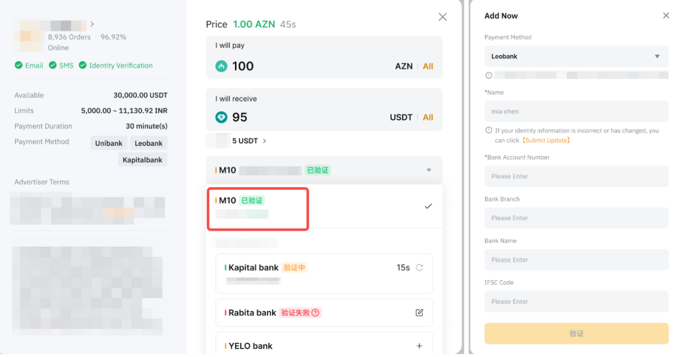 5. 有关银行账户验证要求的更多信息,请参阅常见问题 — 阿塞拜疆用户和 AZN 货币的 P2P 交易