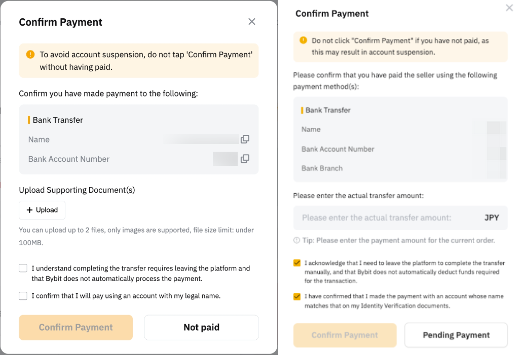 — 您的银行账户名称必须与您在 Bybit 注册的姓名一致。否则,您的账户可能会被暂停,您可能会遇到永久性资产损失,因为卖家有权拒绝向您发放代币。