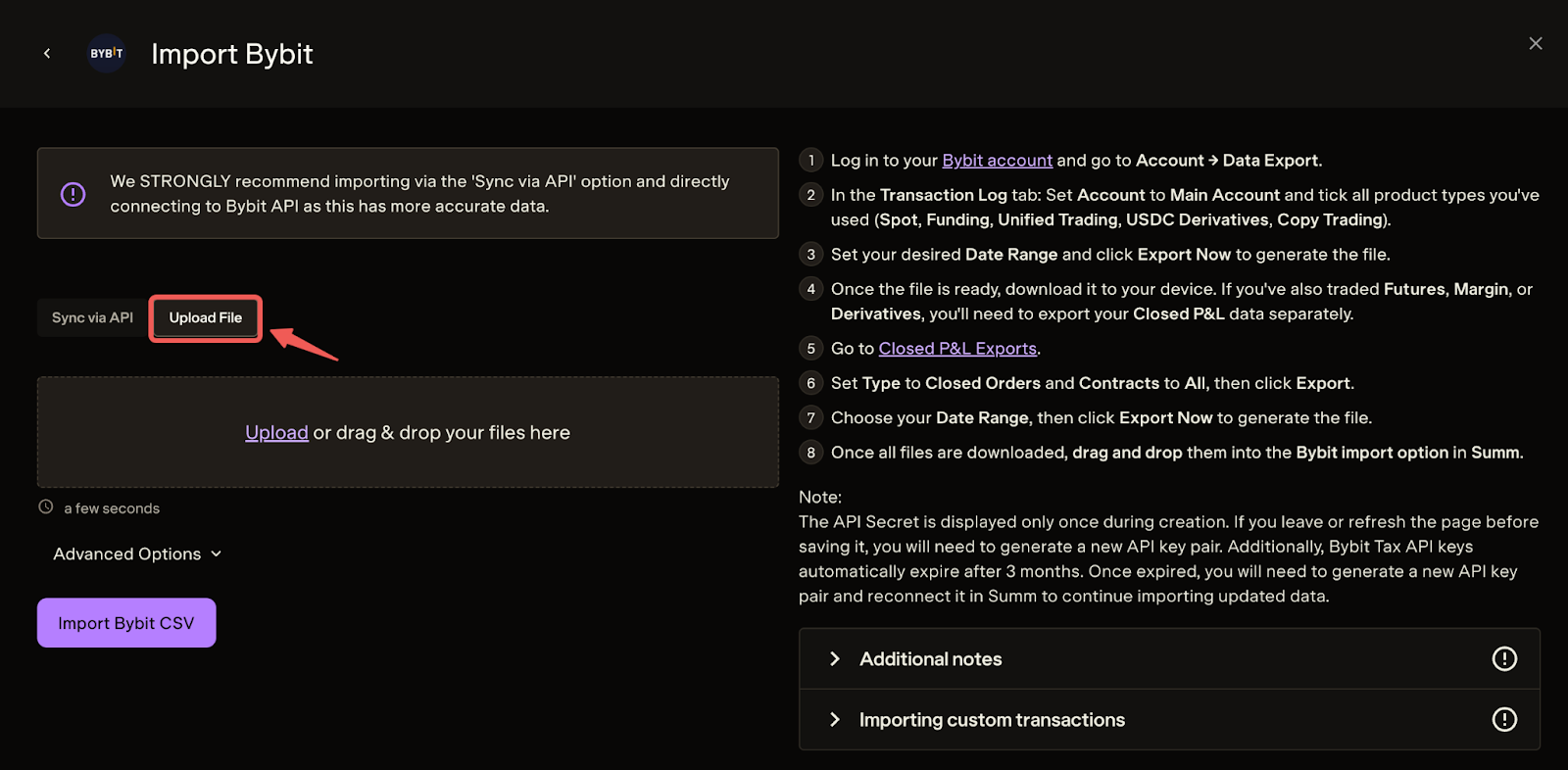 — 请务必验证导入的数据,并仔细检查交易详情是否符合您对 Bybit 的预期。Summ将在数据丢失或文件中出现错误时提醒您。