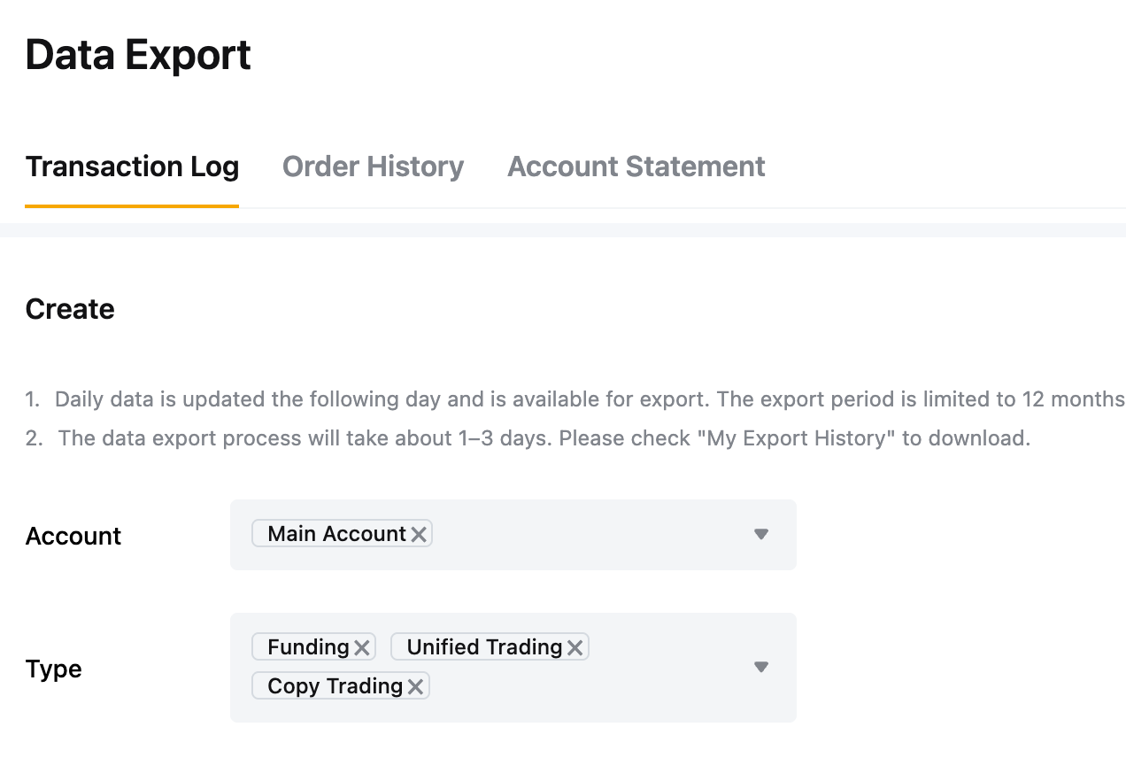 要通过 CSV 文件导入数据,请前往 Bybit 账户的数据导出页面,确保检索以下信息: