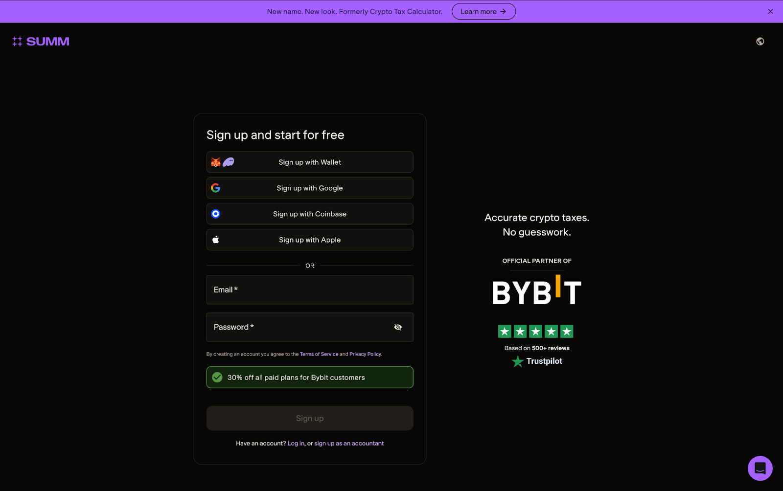 为了让您的生活更轻松,Bybit 已集成到Summ (原名Crypto Tax Calculator)中,因此无需担心手动计算。只需连接账户,交易将自动导入,同时还有一系列税务报告供您提交。让我们来了解如何使用Summ进行 Bybit 税。