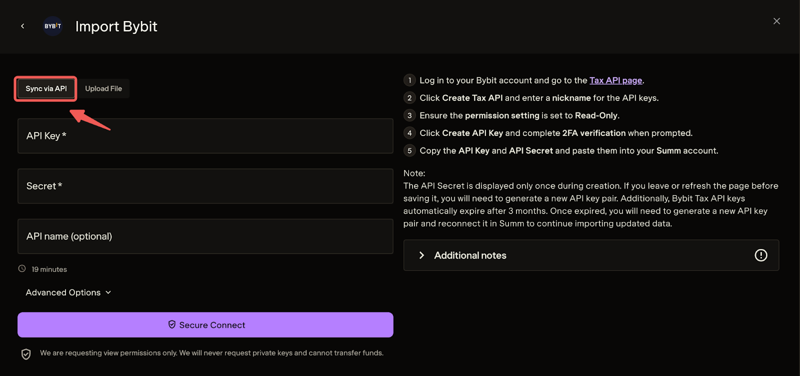 在 Bybit 上创建 API 密钥后,在Summ中选择通过 API 同步选项,然后输入生成的 API 密钥API 密钥。完成后,点击“安全连接”。