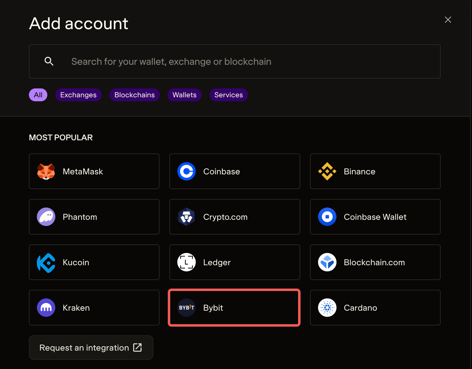 第 2 步: 导航至账户选项卡,点击 + 添加账户。从交易所列表中选择 Bybit。