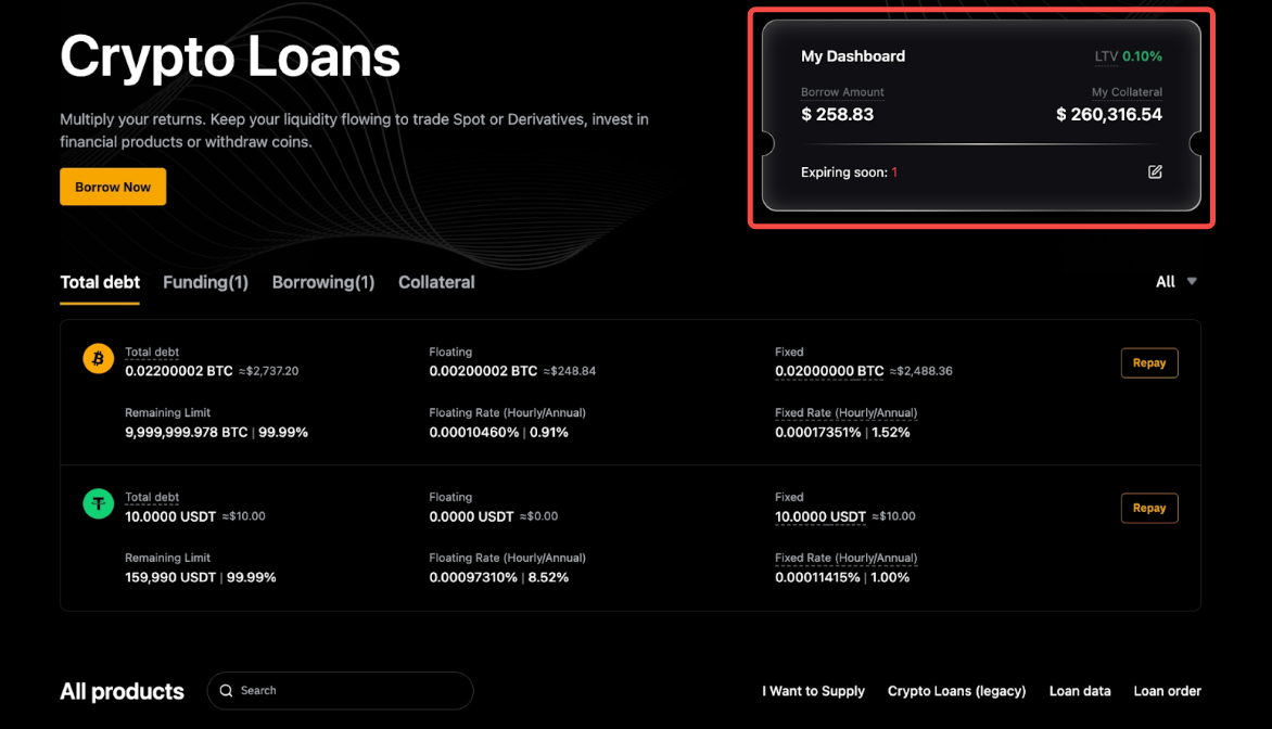 在用户中心上,所有详情均按 总债务、资金、借贷和抵押资产: