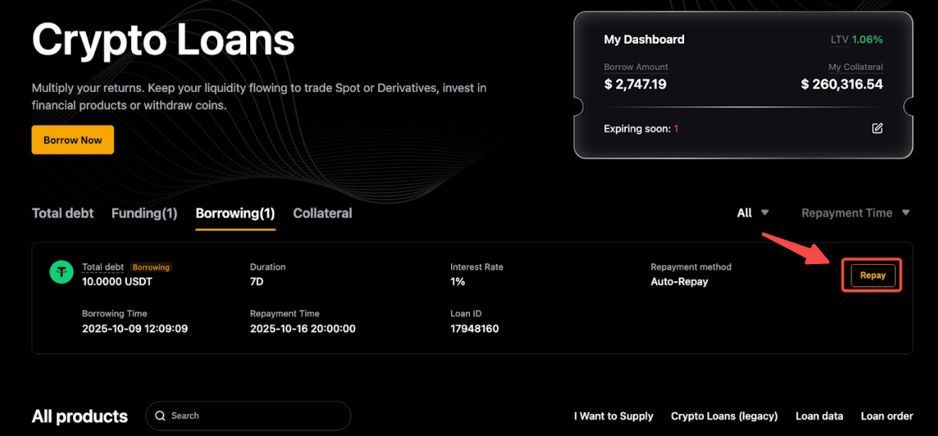 第 1 步:在总览面板中,找到要偿还的贷款,然后点击还款。