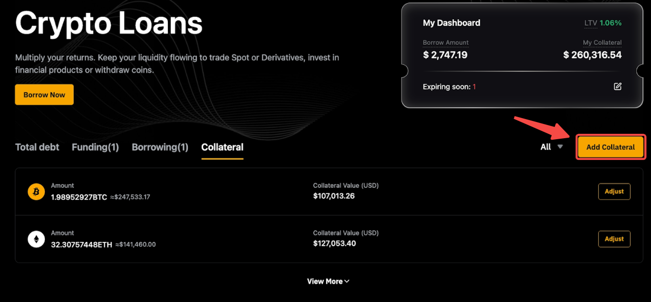 - 抵押资产: 列出所有抵押资产及其数量和 USD 价值。点击调整修改您的抵押品。