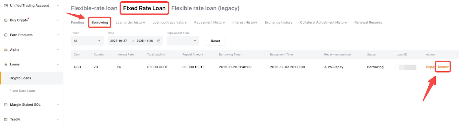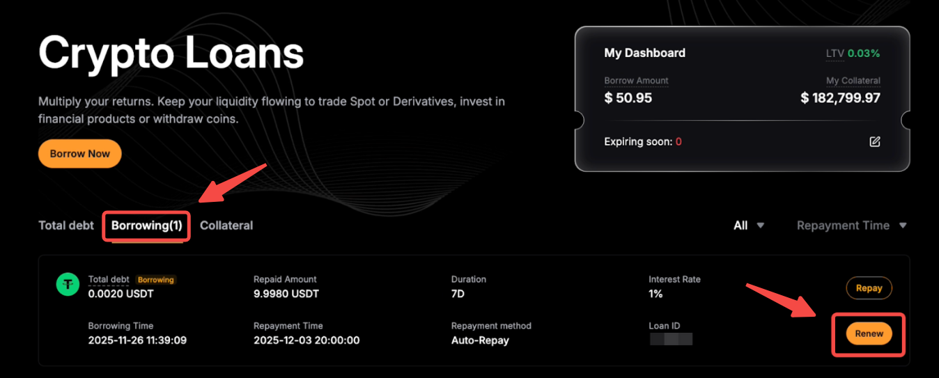 第 1 步:从概览面板中,找到要续期的借币,然后单击续期。