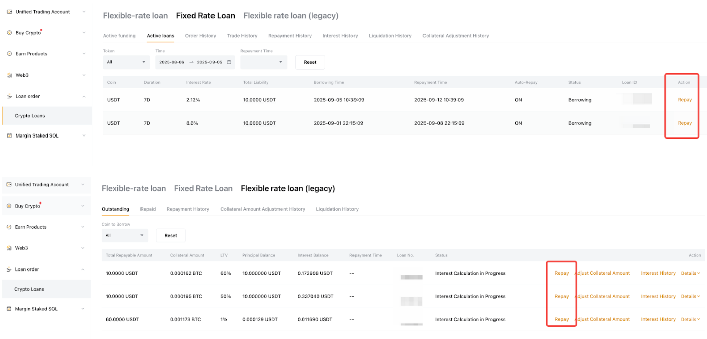 借币续期功能仅适用于已偿还金额大于 0 且距离到期日超过 6 小时的订单。 请注意,每份借币合同最多可续期 5 次。
