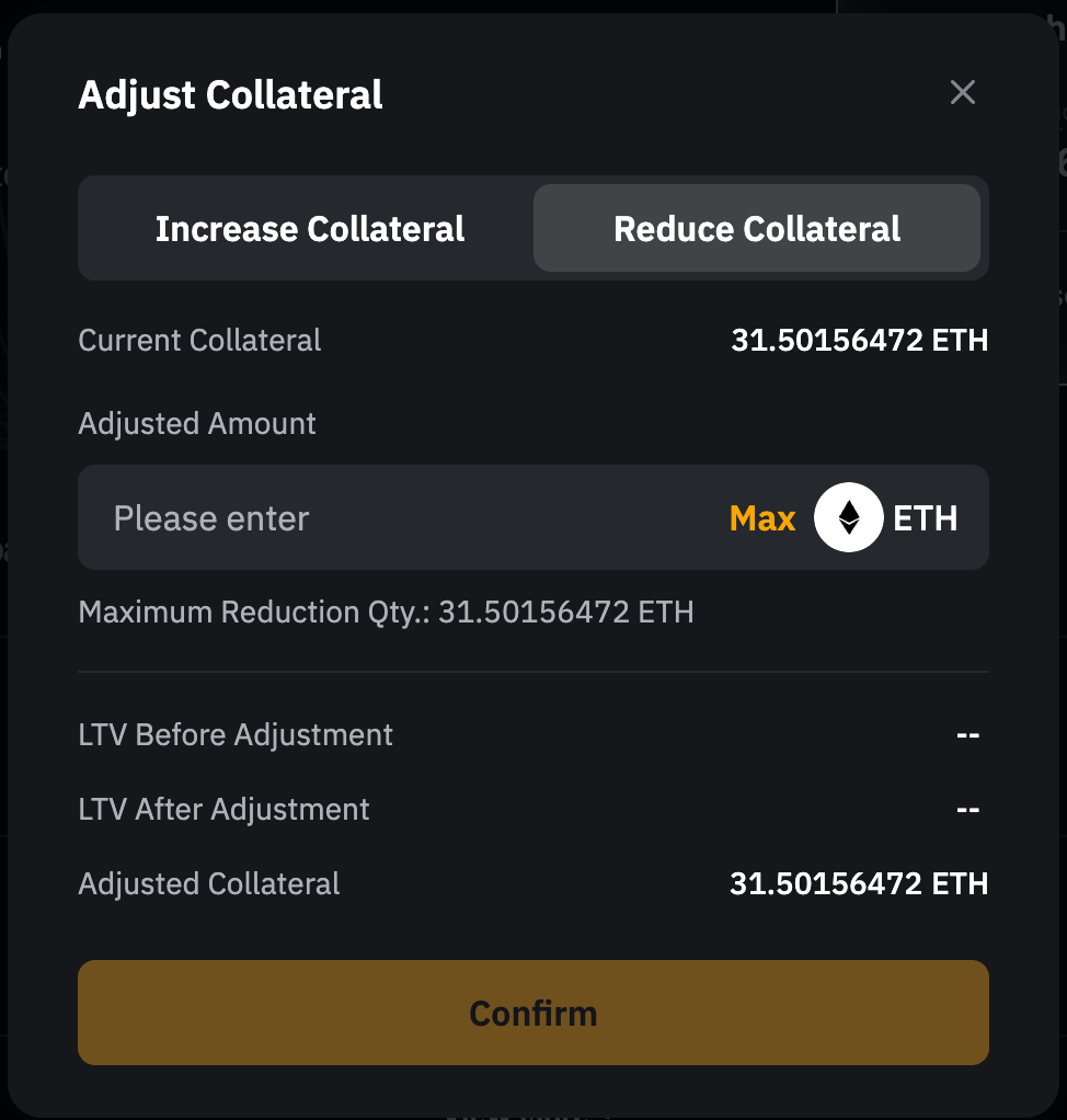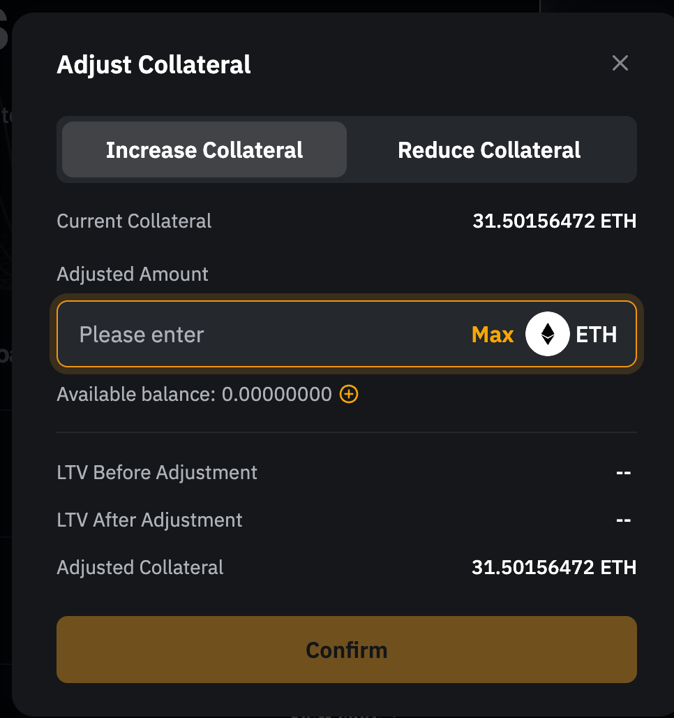 第 2 步: 要调整抵押品金额,请前往抵押资产选项卡。输入追加的金额;或点击最大,使用资金账户全部可用余额。追加抵押资产将降低您的 LTV,减少强平风险。