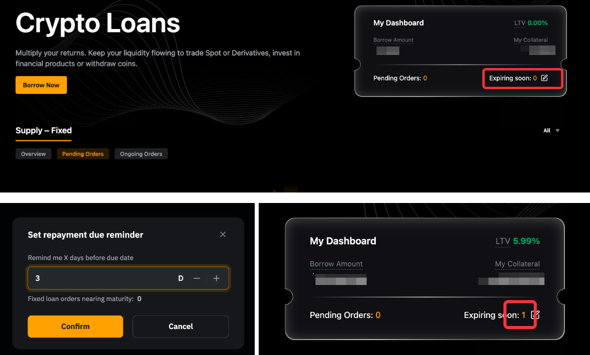 — 您也可以前往质押借币主页,点击用户中心的即将到期旁边的编辑图标,设置到期日前提醒的天数,即可设置还款提醒。还款期接近时,即将到期的产品数量将显示在即将到期的旁边。