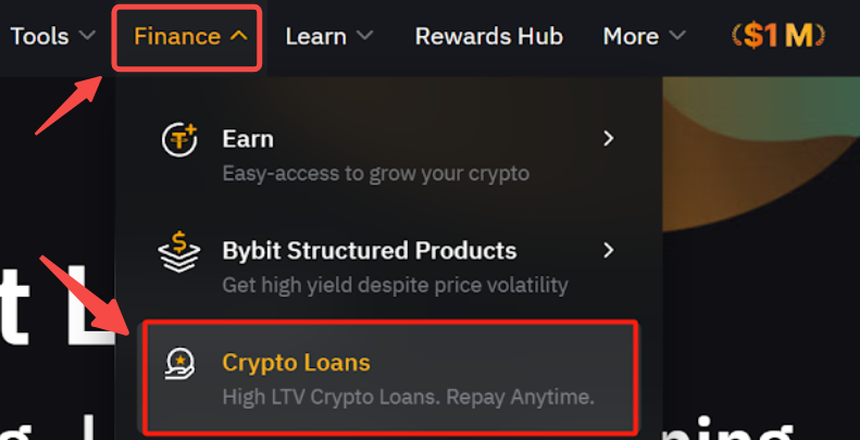 第 1 步:登录Bybit 官网,在导航栏中点击金融 → 质押借币,访问质押借币页面。