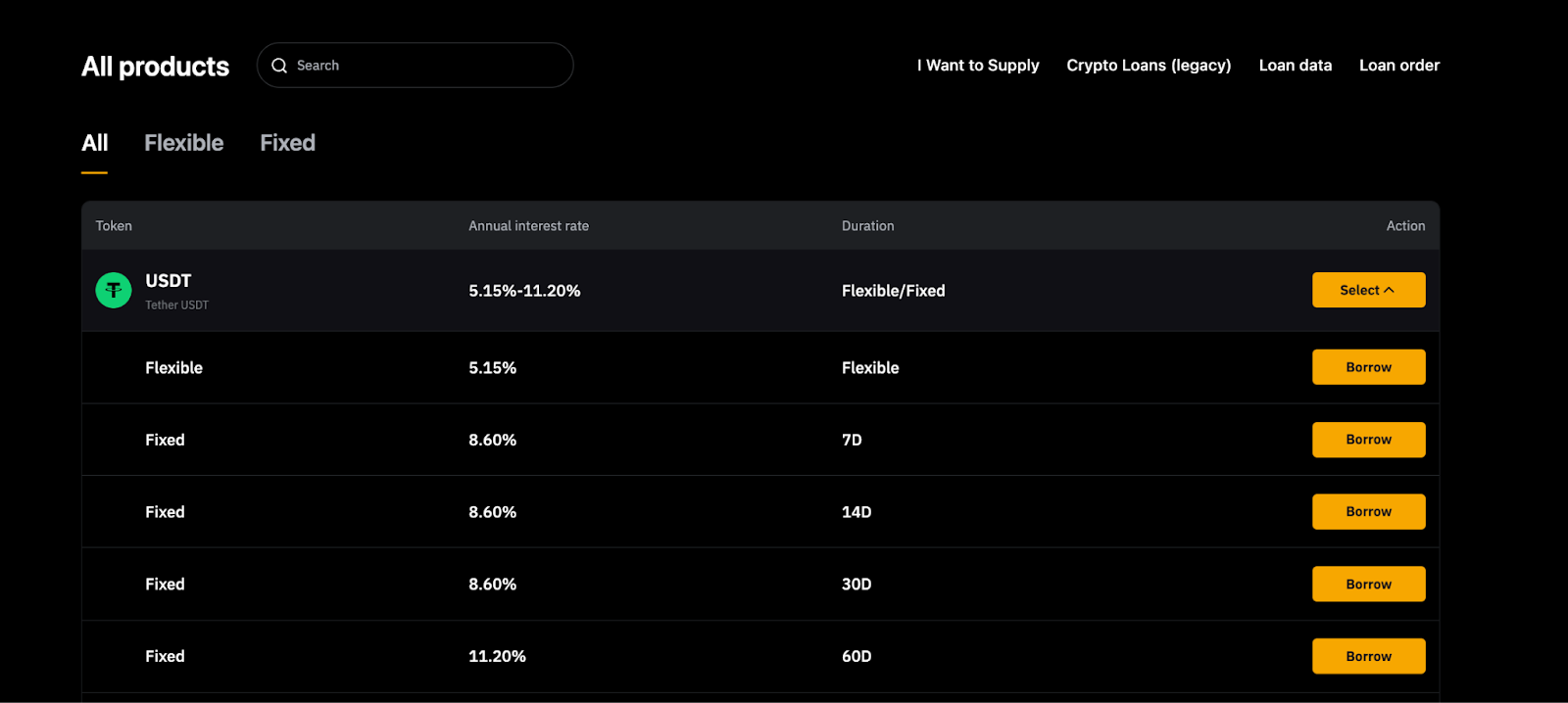 第 2 步:在所有产品一栏下可查看活期与定期借币(存贷易)产品。选择或搜索您想借入的资产,查看可选期限及对应利率。找到符合需求的产品后,点击借币。