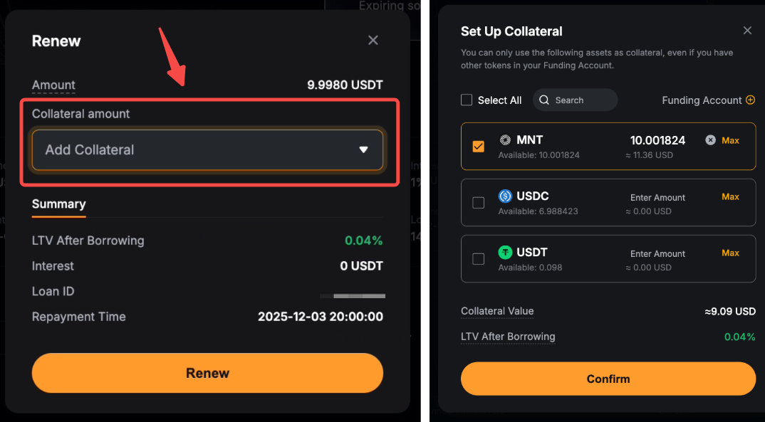 第 2 步:为续期借款设置抵押品,并审核 LTV(质押率)和还款到期日。 单击续期以确认续期。