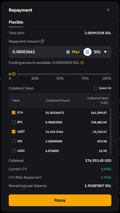 此外,您还可以选择多种抵押资产进行还款。请在确认弹出窗口中查看还款详情,然后点击还款。使用质押币种偿还加密货币贷款将收取费用。 费率将取质押资产和债务资产还款费率中的较高者。