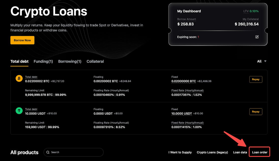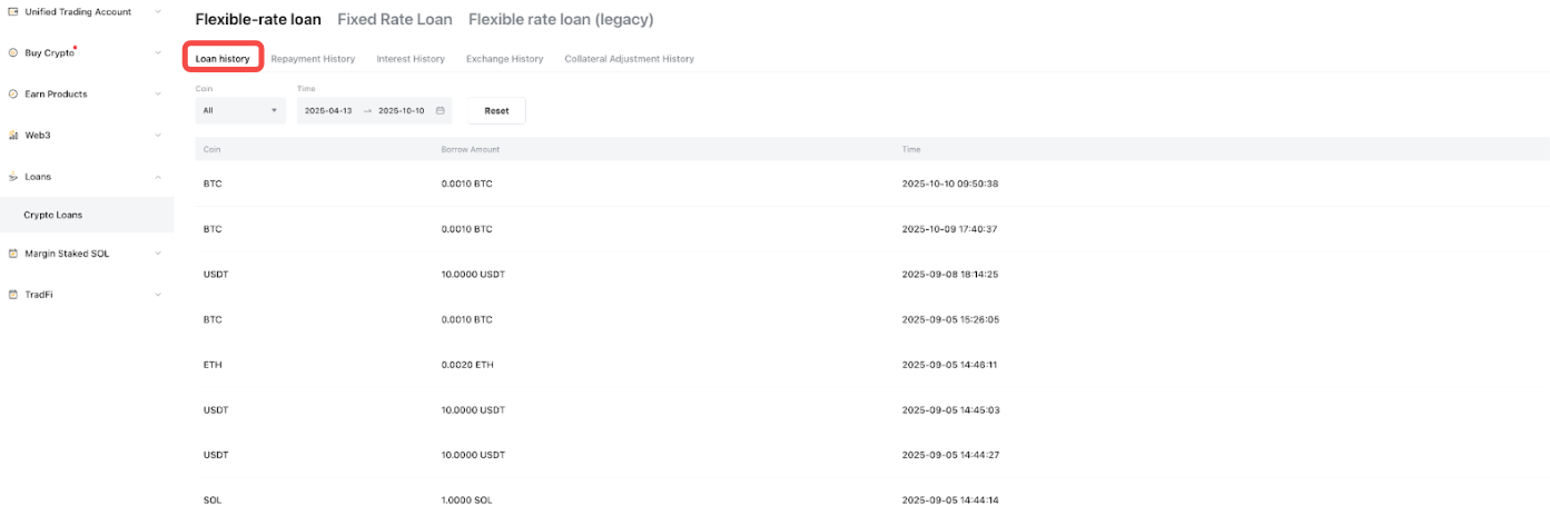 要查看您所有订单的完整列表,请点击总览面板下的借币订单。您可以切换顶部的产品选项卡,查看所有质押借币订单,包括活期负债和定期负债详细了解您的借款记录、还款记录、利息记录、抵押品调整记录等。包含借款、还款、利息、抵押资产等详细信息,还支持按资产类型或时间范围进行筛选查询。