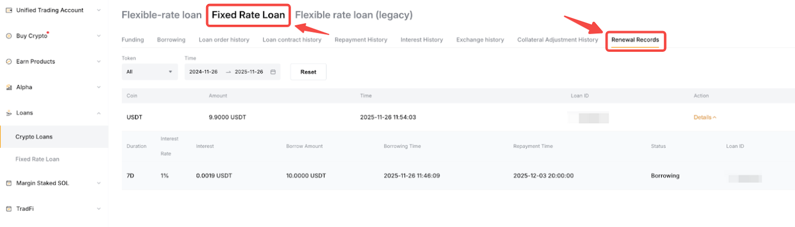 要查看您的续期记录,您可以单击概览面板 → 定期借币 → 续期记录下的借币订单。