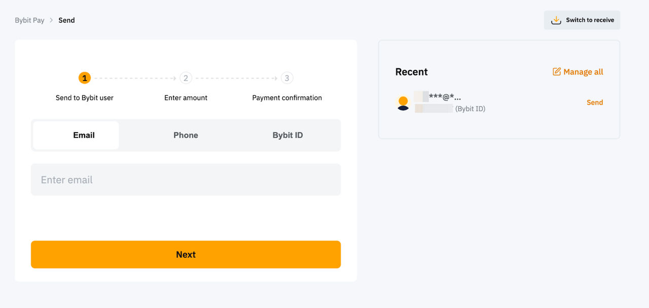 Bybit Pay 内部转账允许您立即发送法定资产后,让您的收款人接收加密货币,或发送加密货币,让您的收款人接收加密货币或法定资产,所有这些操作都无需支付交易费用。目前,通过此功能发送法定资产仅在 Bybit 应用程序上可用。网络支持即将推出。