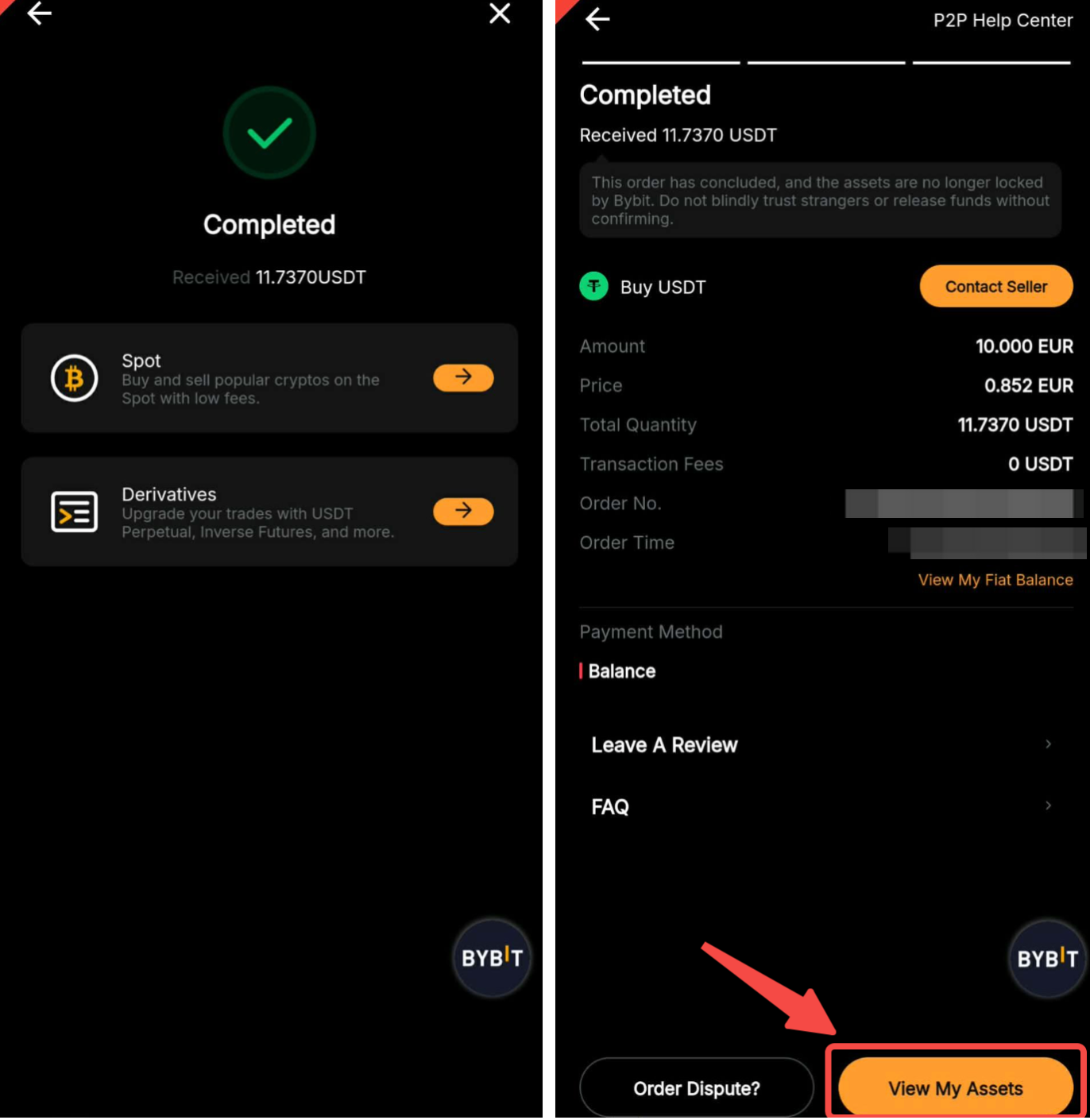 第 7 步:卖家成功发行您购买的代币后,您可以点击“查看我的资产”,查看它们以及您的交易历史记录。您还可以从 P2P 订单历史记录中查看您的订单状态。