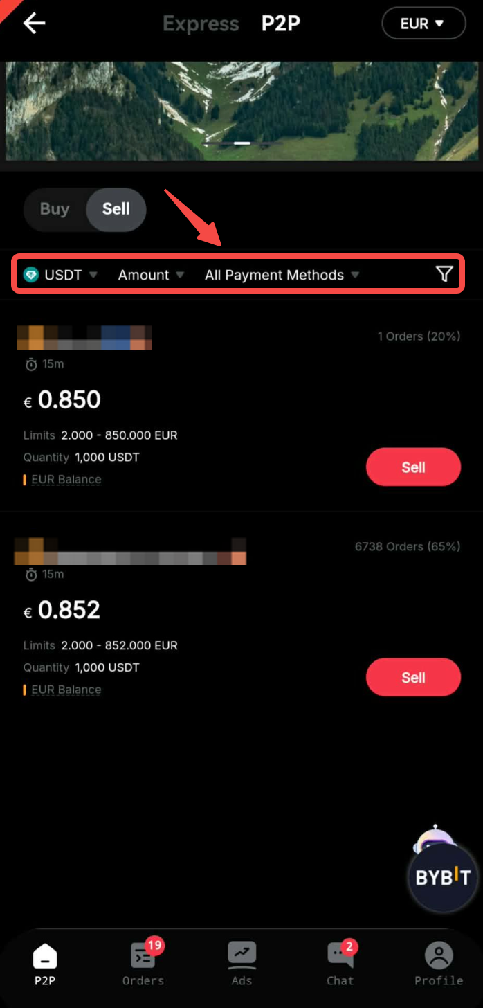 第 2 步:在“卖出”页面上,您可以通过根据交易要求选择所需的法定货币或付款方式 - 法定余额标准来筛选广告商。