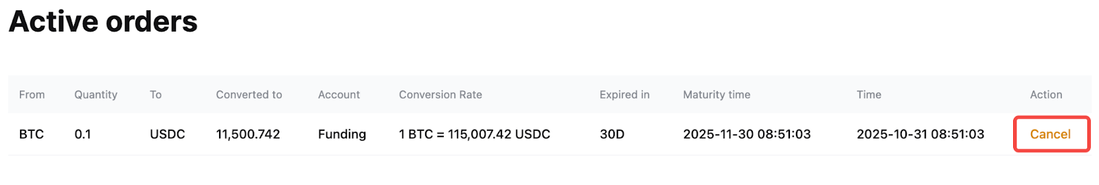 — 通过闪兑下达的限价订单有效期为 30 天。所涉及的资产将被锁定,直到订单被填满或到期。如果订单未在 30 天内填写,则订单将自动取消。