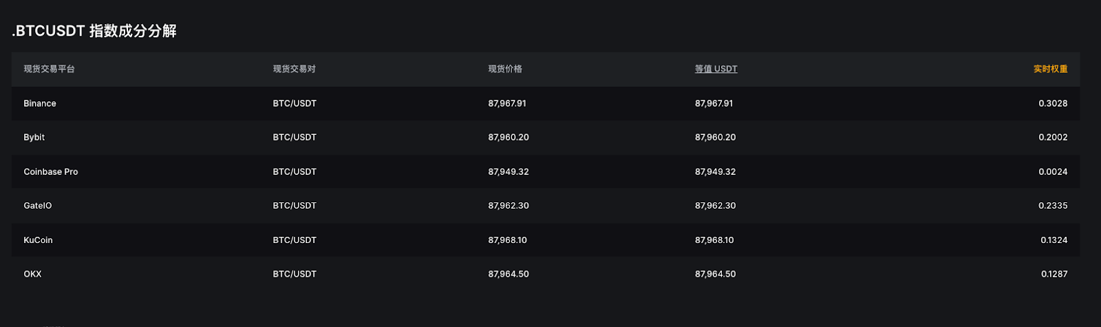 指数价格由 3 大变量决定:现货价格、等值USDT价格和实时权重。