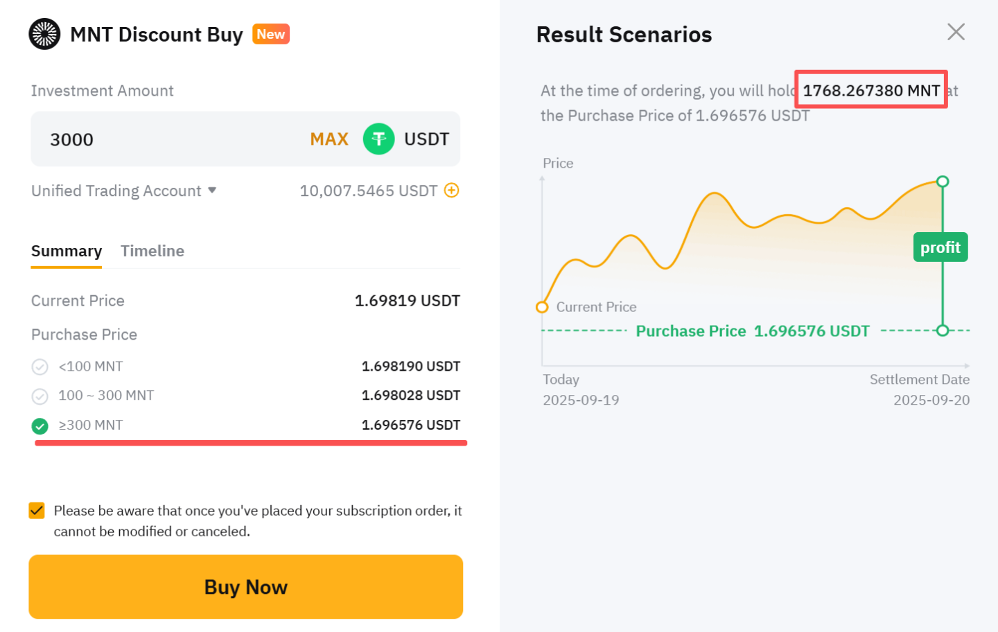 无论结算价格如何,交易员 B 将在结算日以 1.696576 USDT 的价格购买 MNT,收到约 1,768.267380 MNT (3,000 ÷ 1.696576) 。交易员 B 将在申购后立即享受 1,768.267380 MNT 的所有 MNT 持有权益。MNT 资产将在 1 天锁定期后可供使用。