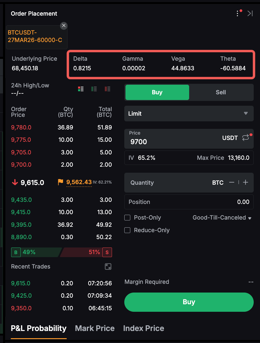 在下单区,您可以看到打算买卖期权的希腊值,包括Delta 值、Gamma 值、Vega 值和 Theta 值。