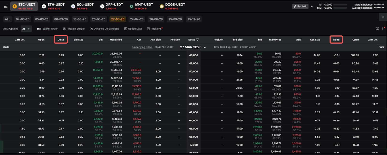 您可以在期权链页面上看到 Delta 值列。此列显示每个期权的 Delta 值。左列为看涨期权,右列为看跌期权。