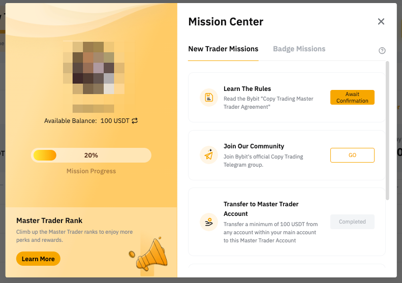 交易達人需要先完成他們的新手任務,才有資格在 Bybit 跟單交易推薦頁面上排名和曝光。交易達人可在不同類別中顯示排名,只需完成 Bybit 系統用於在跟單交易首頁排行榜中顯示個人資料的兩階段評估流程即可。具體階段如下: